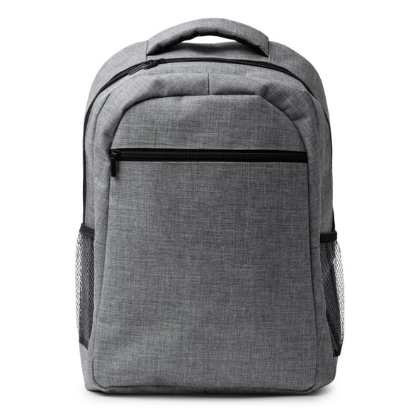 Computer backpack made of RPET 600D with melange finish. Large main compartment with internal pocket for 15" laptops. Front zip pocket. Side pockets. Padded shoulder straps and back panel. Capacity 20L.