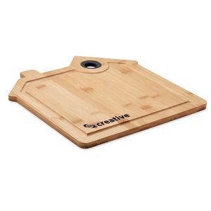 Huisvormige snijplank in bamboe met groef en opening om op te hangen.